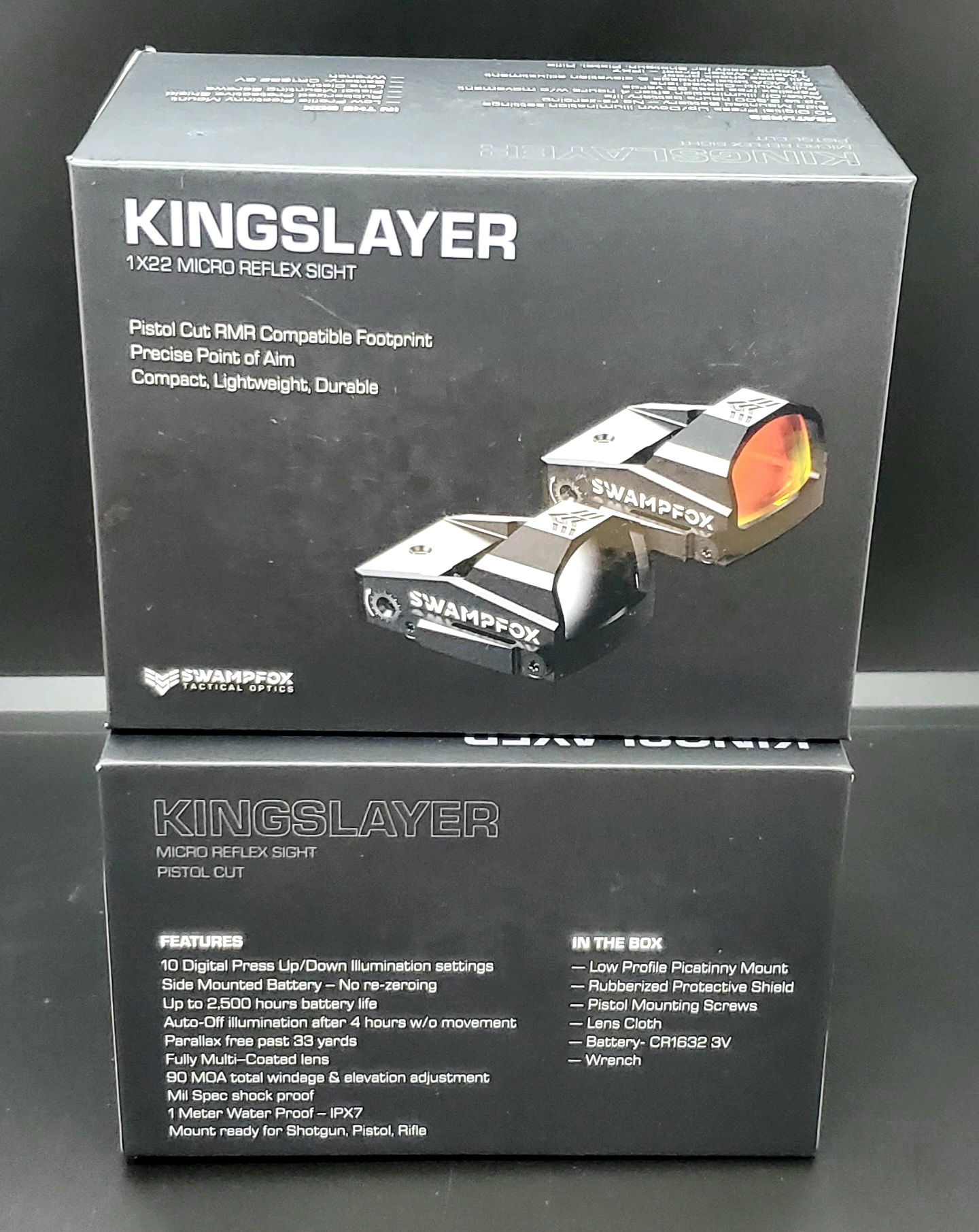 The Kingslayer is a super compact, highly accurate micro reflex open red dot sight featuring three reticle options that allows for fast target acquisition with both eyes open while focusing through to the target. It is an RMR-compatible footprint for reciprocating pistol slides . For rifle or shotgun platforms, Kingslayer comes with a low profile 1913 Mil-Std Picatinny mount already installed. Kingslayer is waterproof, fog resistant and features a scratch resistant, anti-glare lens coating. Built like a tank, Kingslayer can withstand 800 g’s of impact and maintain zero come what may.